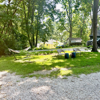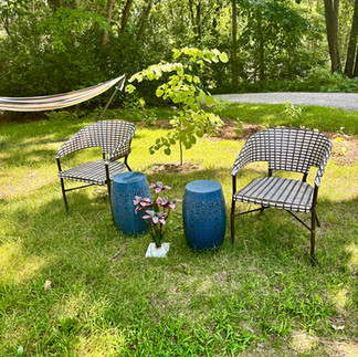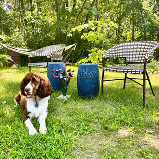 I’ve always adored an intimate sitting area randomly nestled in a grassy-woodsy area. so instead of just wanting it all the time I took the time to make one in our yard. action inspired by the recent landscape update we did at Snelly’s place. this seating brings all the whimsical vibes I could have imagined + you already know it’s functional for how we hang. when everything else is shaded, the evening sun highlights this little nook so good. we love to have a little evening drink here while Forrest chills on our feet in the grass - but more often he loves sitting on his golf cart close by.