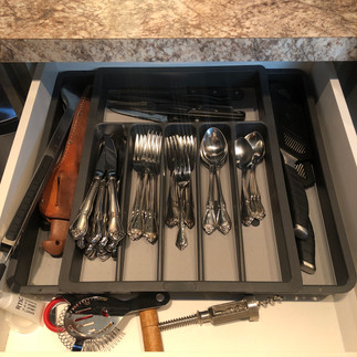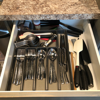I ordered this bamboo/sustainable expandable kitchen divider that has a variety of needed compartments. even though there is a lot going on in this drawer of tools, having them all a cohesive look makes it easier on my eyes. and this is only a fraction of the storage containers we own, the rest are at the storage unit. tbd on this situation, its a work in progress.
